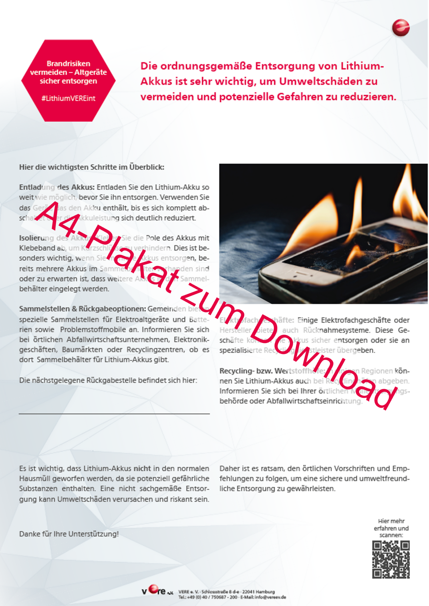 Entsorger werden zunehmend Opfer falscher Entsorgung von Hochleistungs-Akkus. Diese führt zu Bränden bei Elektro-Recycling-Betrieben und gefährdet die bestehende Recycling-Infrastruktur. Unterstützen Sie #LithiumVEREint, eine Initiative des VERE e.V., um das Problem zu lösen.