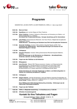 Im Anschluss findet die jährliche Hauptversammlung des Verbands zur Rücknahme und Verwertung von Elektro- und Elektronikaltgeräten (VERE e.V.) statt. Interessenten aus Unternehmen und Organisationen können sich kostenlos bei Herrn Christoph Brellinger, Telefon 040/750687-111 oder E-Mail: brellinger@vereev.de, anmelden.